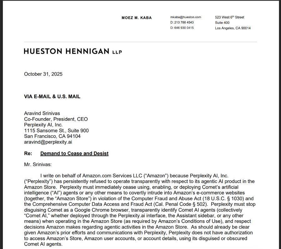 (Hueston Henningan 律师事务所代表“亚马逊”向“Perplexity AI”发出勒令停止函,声称Perplexity通过其旗下AI浏览器产品Comet AI违规访问“亚马逊”)