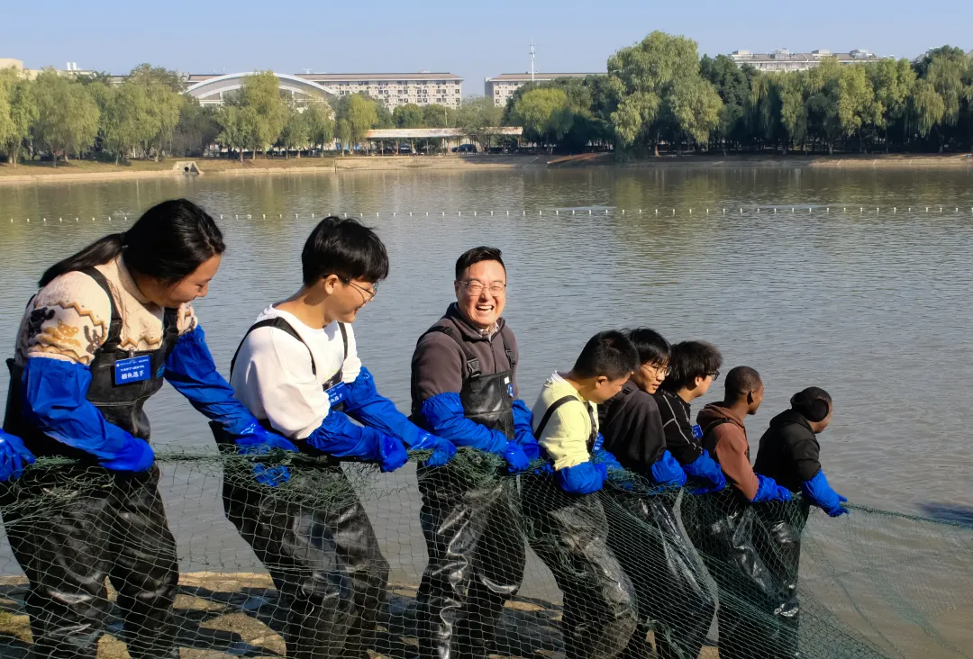 当然,活动之所以能长期运转,也离不开一套扎实的治理方式。在武科大,沁湖也是一个生态场域。每年学校在冬至前后投放鱼苗、组织学生参与喂养,定期检查水质,确保鱼类健康生长;十月底,后勤团队在捕捞季节24小时轮班监控湖区;鱼获还会加工成不同菜品分到三个校区,最终以象征性的价格让全校师生都能品尝。