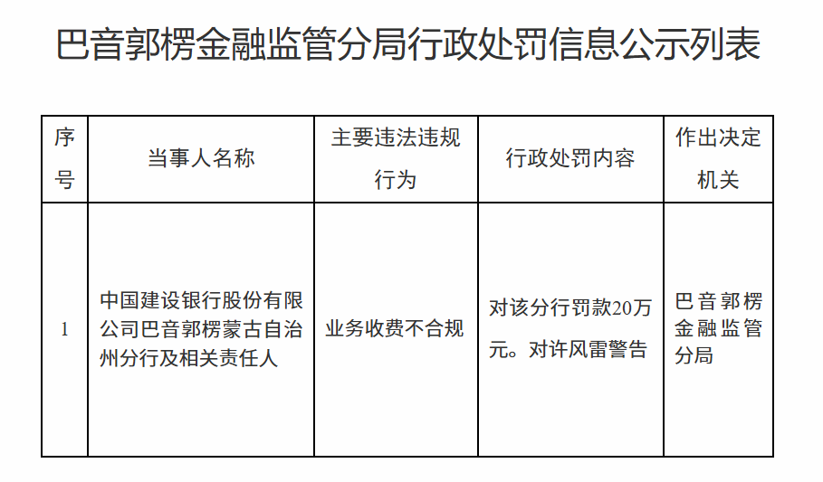 11月26日泰兴隆配资,巴音郭楞金融监管分局行政处罚信息公示列表显示,中国建设银行股份有限公司巴音郭楞蒙古自治州分行及相关责任人因业务收费不合规被罚款20万元。许某雷被警告。