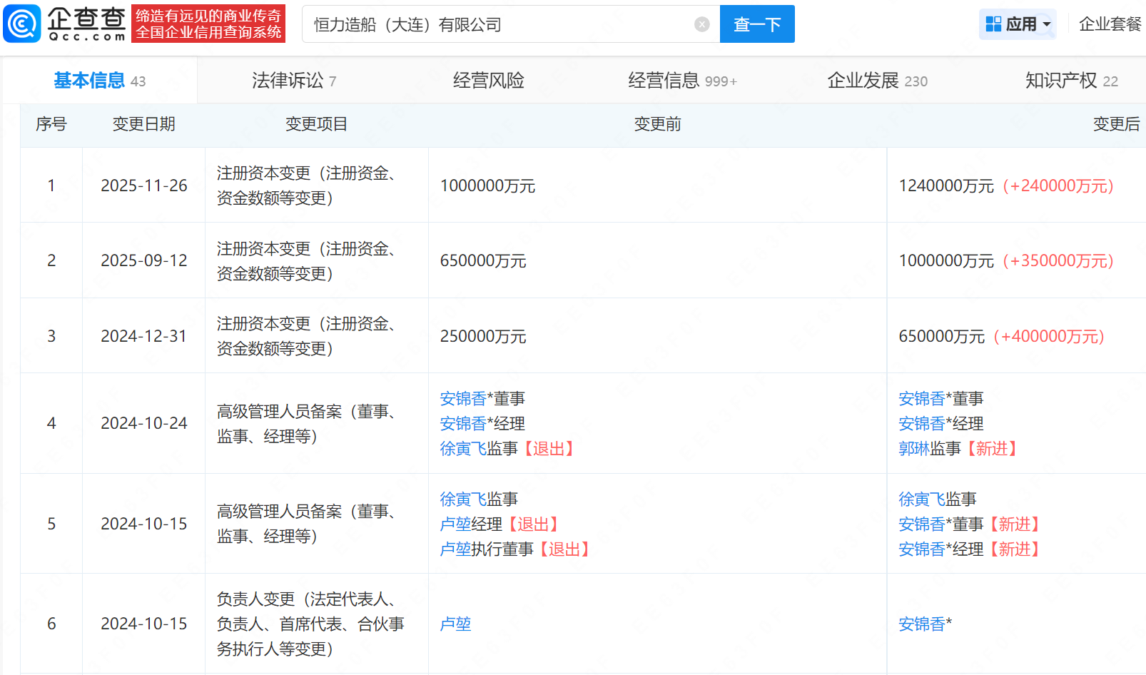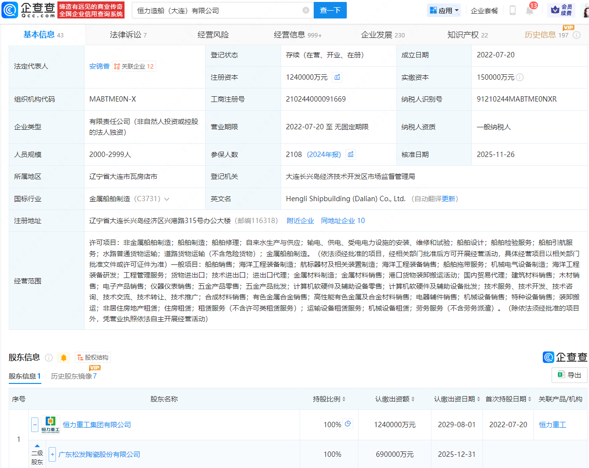 近日,恒力造船(大连)有限公司发生工商变更荣耀配资,注册资本由100亿元增至124亿元,增幅24%。该公司成立于2022年7月,法定代表人为安锦香,经营范围包含非金属船舶制造、船舶制造、船舶修理等,企查查股权穿透显示,恒力造船(大连)有限公司由恒力重工集团有限公司全资持股,后者为*ST松发(603268)全资子公司。